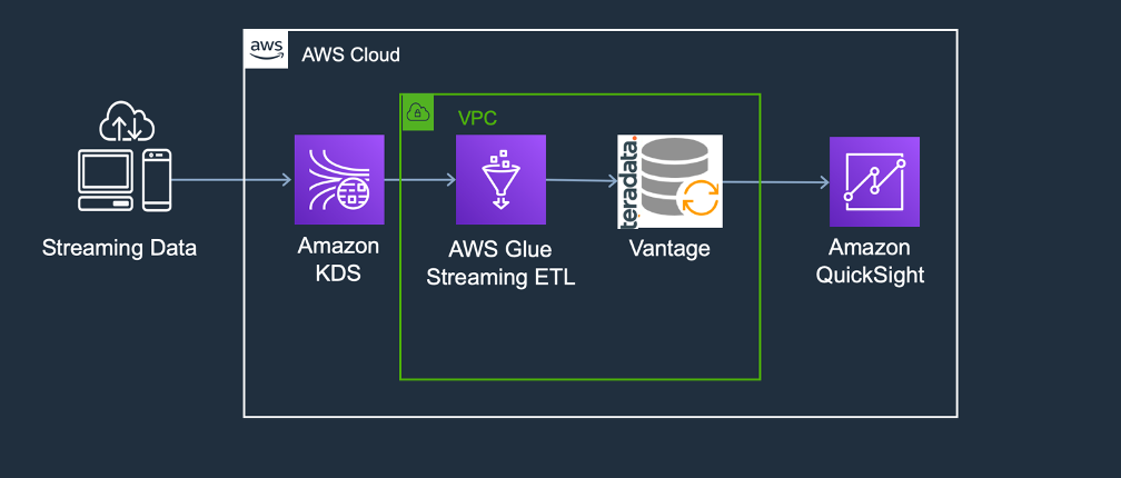The following architecture illustrates the flow of data from Amazon Kinesis, through which it is streamed by AWS Glue to Teradata Vantage where it’s analyzed, and finally to Amazon QuickSight, where it’s displayed. In this tutorial we will be using a simple Lambda function to stimulate a streaming source.