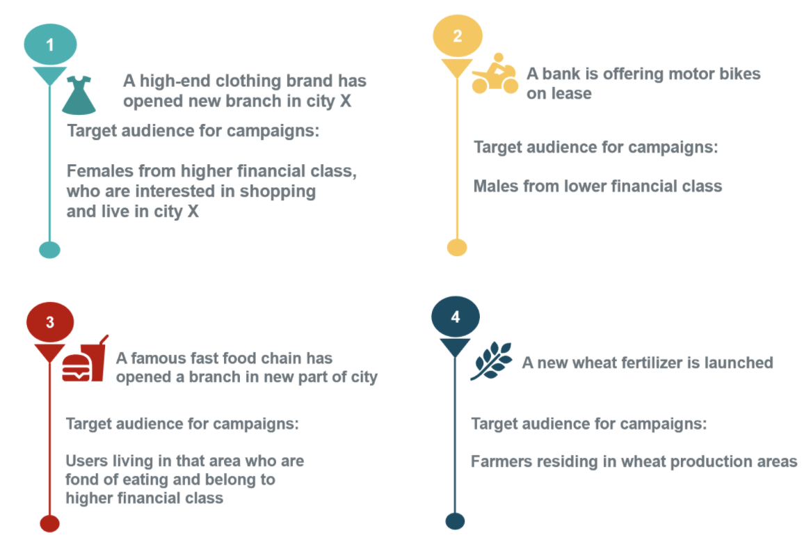 Customer demographics available in the system are age, gender, mobile phone used, and subscriber’s location. Telecom companies run campaigns for different clients; the audience must be selected based on the type of business their client is running and identification of their target market. Some examples are:
