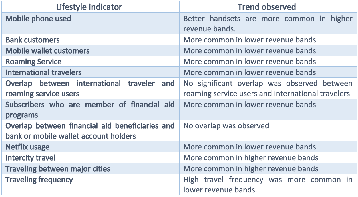 Based on the trends observed in analysis and lifestyle indicators, tagging rules were created for each SEC. For example, users with high-end handsets or roaming services are tagged in higher SEC bands, regardless of revenue generated.