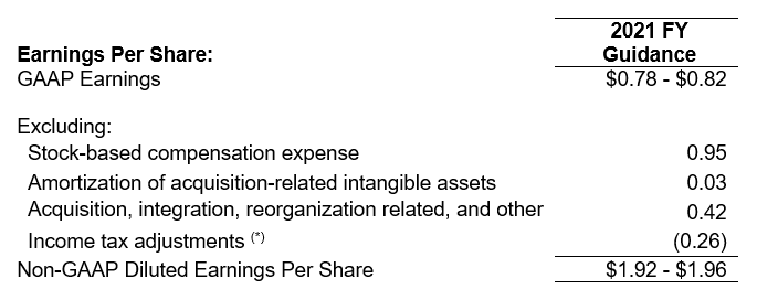 The following tables reconcile Teradata’s projected EPS under GAAP to the Company’s projected non-GAAP EPS for fiscal 2021, which exclude certain specified items. Our management internally uses supplemental non-GAAP financial measures, such as gross profit, operating income, operating margin, net income, and EPS, excluding certain items, to understand, manage and evaluate our business and support operating decisions on a regular basis. The Company believes such non-GAAP financial measures (1) provide useful information to investors regarding the underlying business trends and performance of the Company’s ongoing operations, (2) are useful for period-over-period comparisons of such operations and results, that may be more easily compared to peer companies and allow investors a view of the Company’s operating results excluding stock-based compensation expense and special items, (3) provide useful information to management and investors regarding present and future business trends, and (4) provide consistency and comparability with past reports and projections of future results.