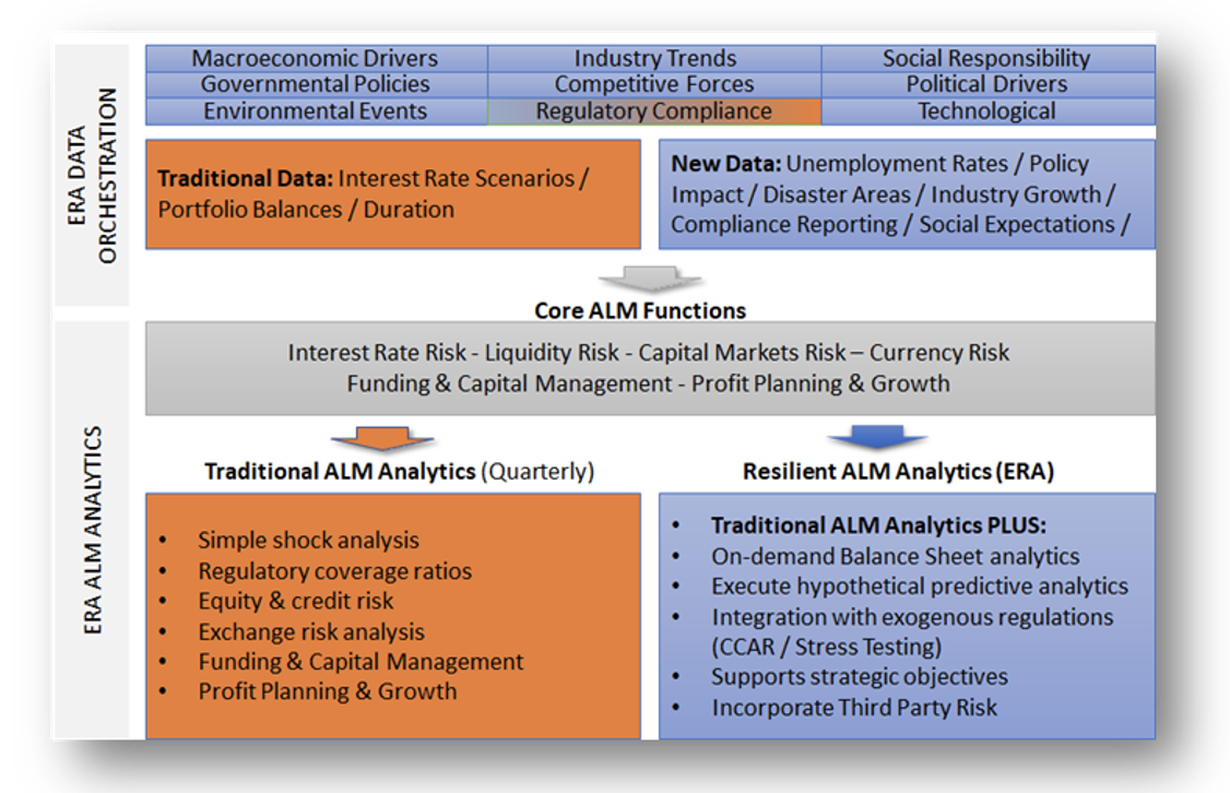 The schematic below presents an illustrative model that broadens the ALM (asset liability management) function to include other drivers. In this model, ERA enables the orchestration (i.e., the sourcing) of an expanded set of data that is supports both traditional interest rate risk analytics and advanced resilient analytics. In practice, for example, new data capturing regional climate changes can be used as a driver to changes in borrowing, loan defaults or workouts, repayment, liquidity positions and others that directly impact the balance sheet.