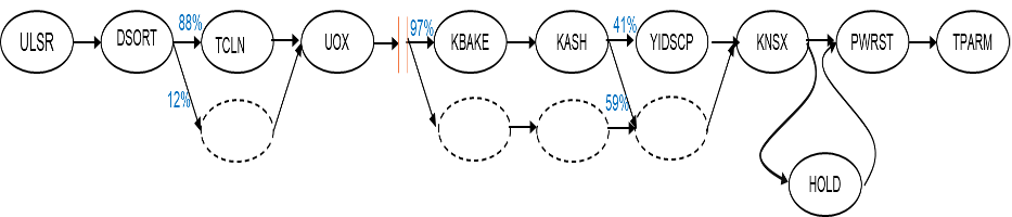 A full process model would show all likely paths from start to end, including multiple parallel paths, multiple skips, holding locations, and reworks. The process flow is derived from tracking an item through the process. This is conveniently done with NPath on the event sequence as some steps are skipped. Then NPath is used to track lots through the steps.