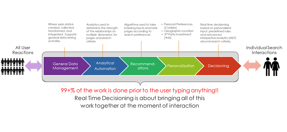 Third, search engine providers use their own analytical “secret sauce” to provide predefined ranking scores based on provided criteria and use other analytics to augment these scores. This recommendation score can be augmented in the later step, but it’s a process-intensive workload. Trying to rank every single possible search criteria with every possible web object is not something that can be run in “real time.” Instead, recommendations are preprocessed or values used to make a final ranking recommendation are determined beforehand. We refer to this as the recommendations.