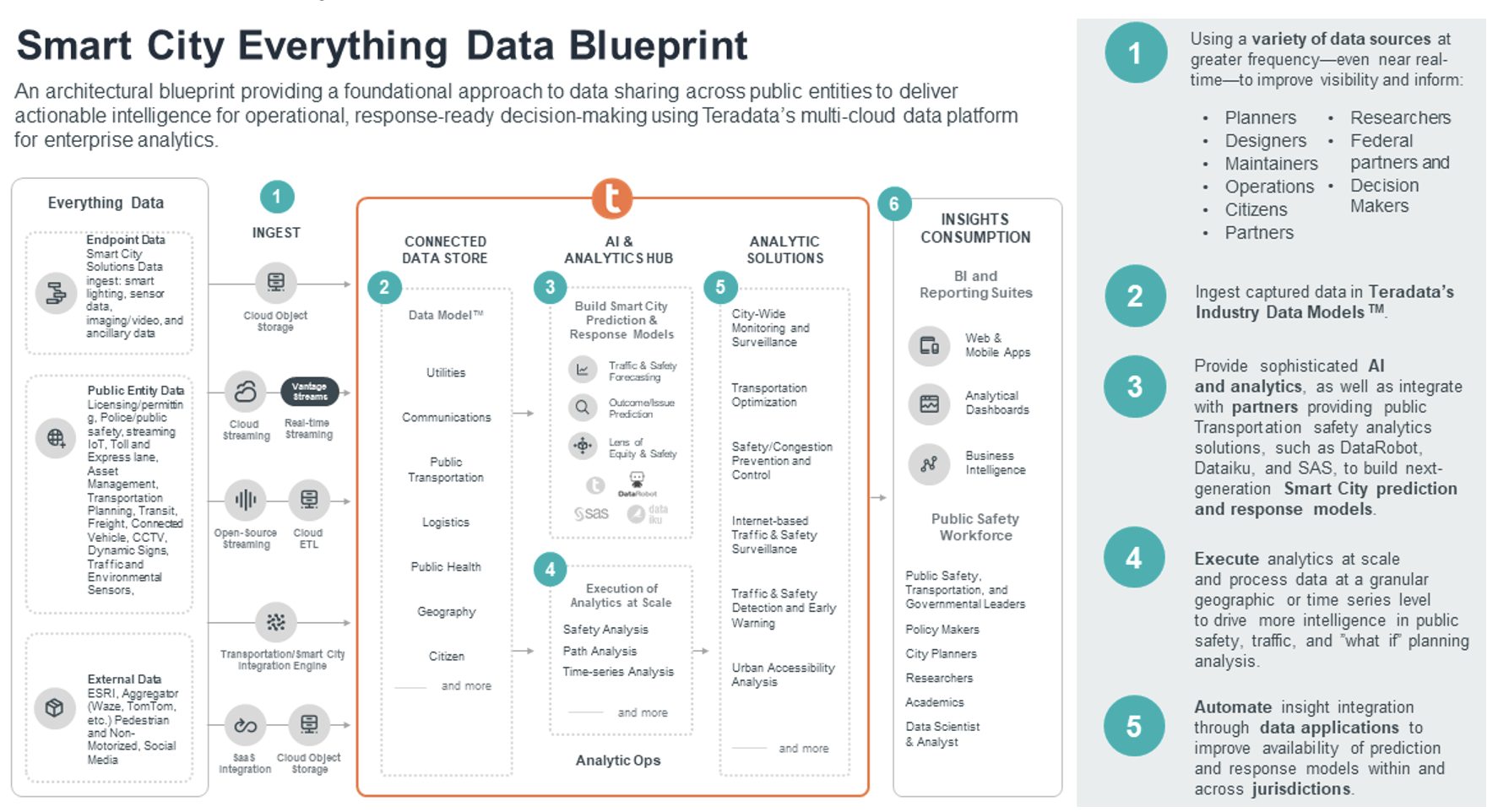 Teradata Vantage is uniquely capable of responding to the urgent needs that Smart City practitioners can leverage to enable Smart City goals and accelerate insights from access across existing data and future endpoint solutions. Teradata continues to deliver innovative solutions to unlock all the data available to Smart Cities so complex analytic challenges can be solved. We enable data scientists to operationalize their Smart City models with a connective tissue that centralizes the critical capabilities for AI/ML model development, management, governance, and monitoring at scale. Teradata Vantage allows Smart Cities to combine descriptive, predictive, and prescriptive analytics with autonomous decisioning, ML functions, and enablement in a single connected analytic platform, which significantly simplifies the analytic ecosystem and accelerates insight.