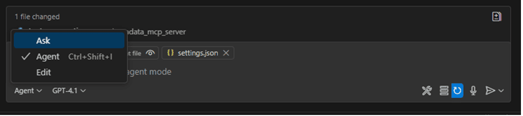 • Ensure it’s set to Agent Mode (not Chat Mode). If you don’t see this, go to command palette to enter Copilot: Toggle Agent Mode.