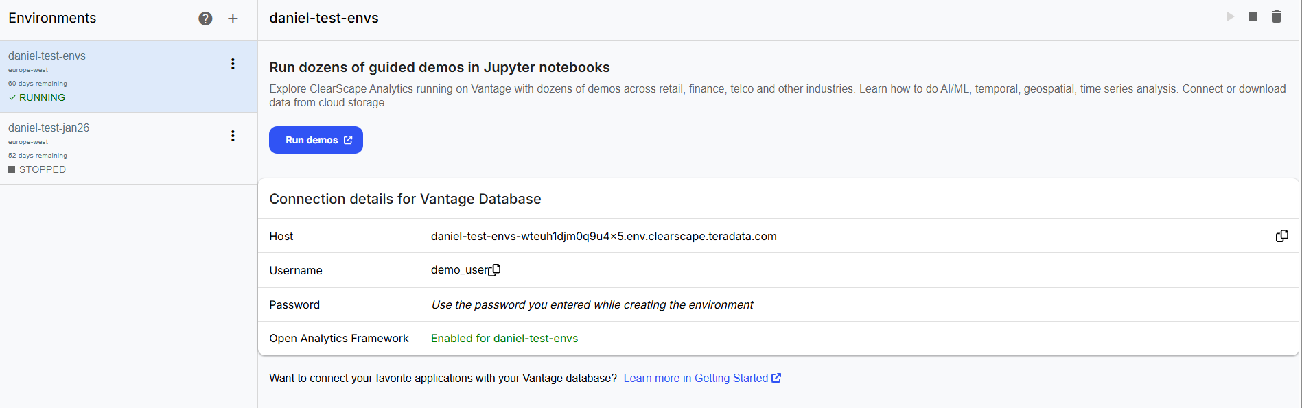 ClearScape Analytics® Experience is a free experience with access to limited resources. For a full demo on a production-grade Teradata environment, see Teradata Enterprise AgentStack.