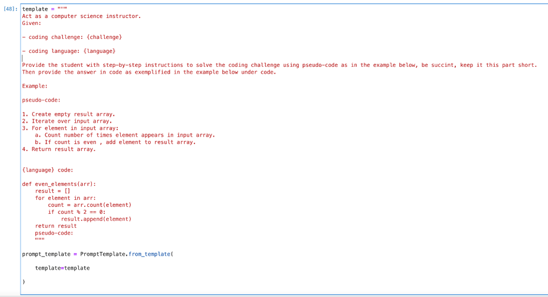 Fantastic! Now, let's utilize the PromptTemplates class from LangChain and integrate our five key elements of prompt engineering. This approach will help us guide our model's output effectively. We’ll merge these elements to establish a structured framework aimed at generating targeted and informative responses to programming challenges.