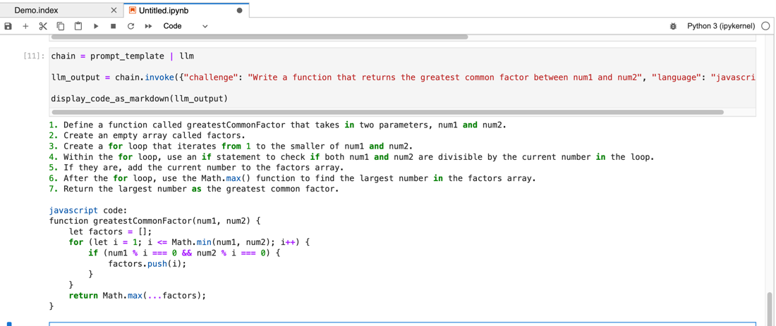 llm_output = chain.invoke({"challenge": "Write a function that returns the greatest common factor between num1 and num2", "language": "javascript"})