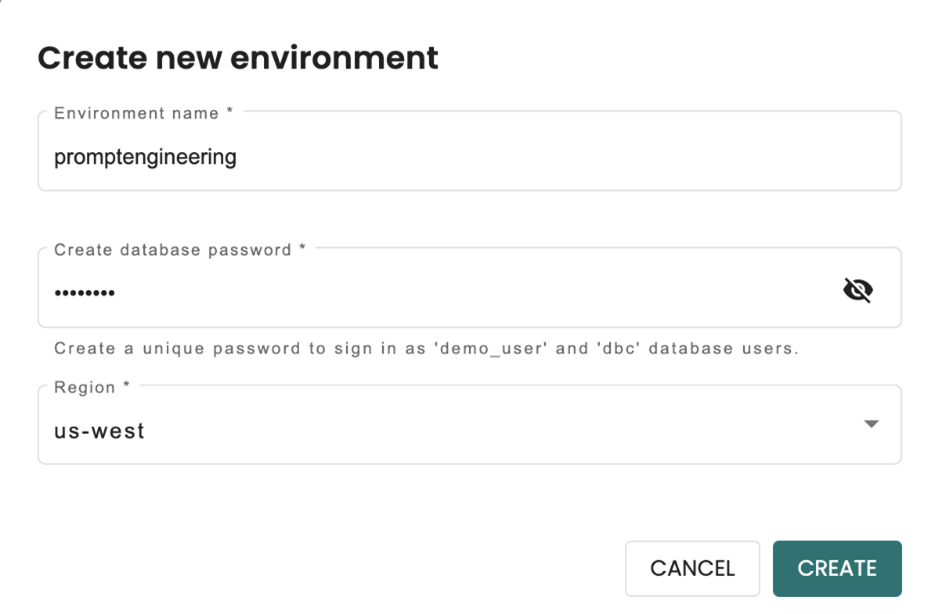 Window to create a new environment featuring fields for environment name, database password, and selection of region.