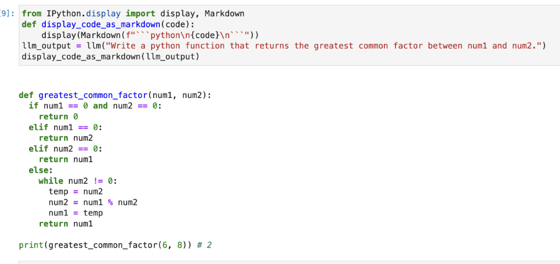 llm_output = llm("Write a python function that returns the greatest common factor between num1 and num2.")