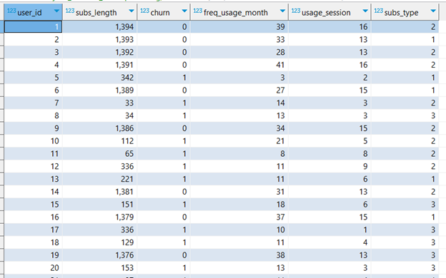 ACCUMULATE ('user_id','subs_length','churn','freq_usage_month','usage_session')