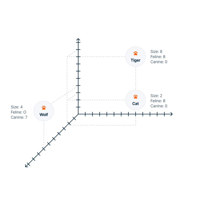 A tiger and cat are closer together, while a wolf is farther away. The coordinates are provided according to a hypothetical space with three dimensions with defined meanings (size, feline, and canine), only as an illustration, actual embeddings are much larger and the features the dimensions represent are not specifically defined.