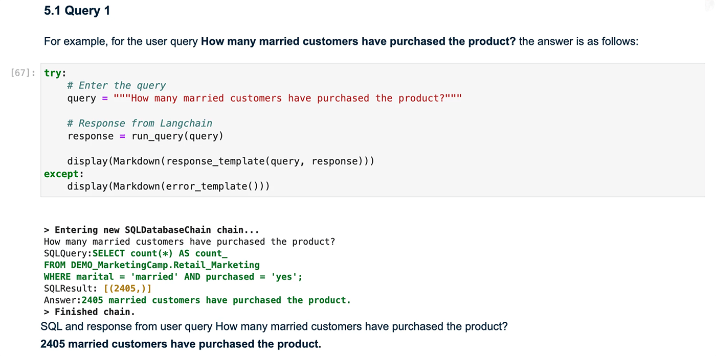 In this tutorial, we'll take those techniques a step further to create a question-and-answer generative AI system. We'll demonstrate how you can effortlessly translate your English queries into SQL and receive responses from your analytic database in plain English, as shown in the image below.