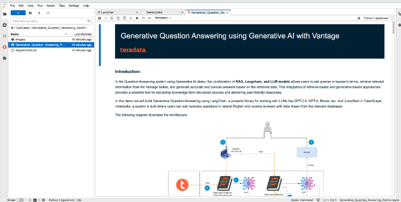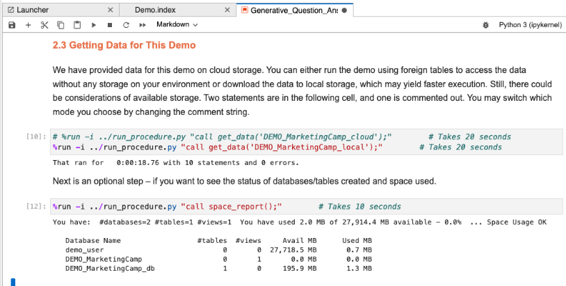Once you open the Generative_Question_Answering_Python.ipynb, scroll down and run the first four code cell blocks by selecting the cells and pressing Shift+Enter to import the different client libraries and establish a connection to VantageCloud.