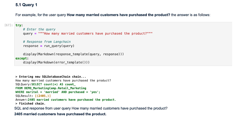Now you are ready to run LangChain’s database chain to translate your English question to SQL and get the results from your database. Give it a spin in the following cell with a relevant question.