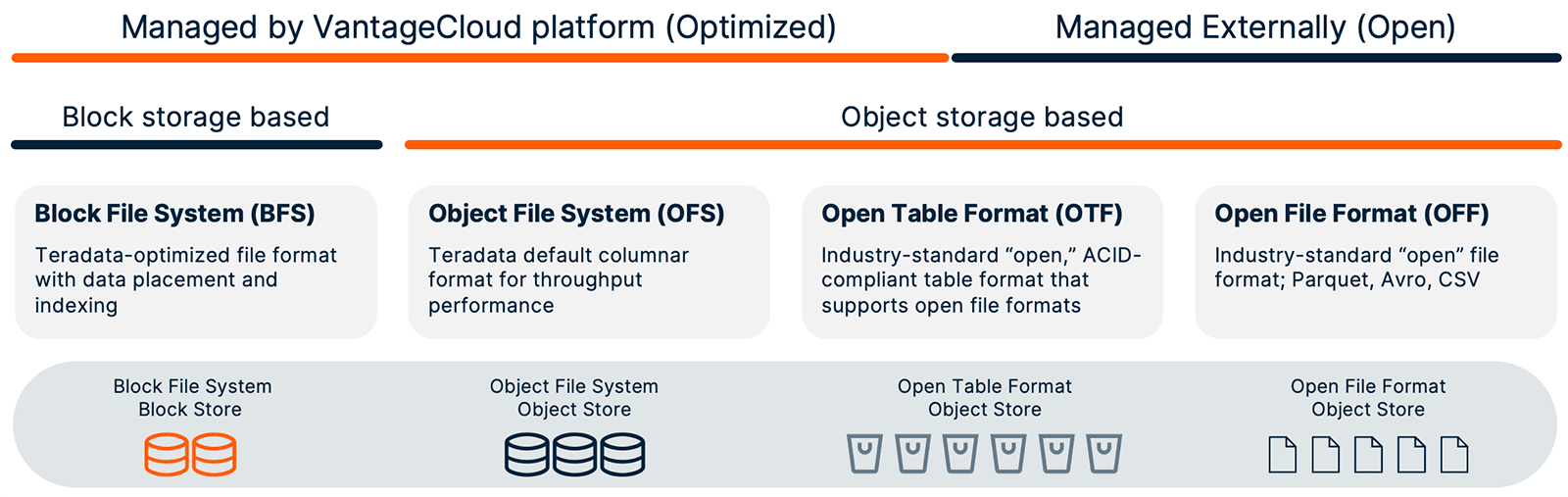 - Object storage: Teradata’s optimized object file system is designed for performance, leveraging a default columnar environment within an object storage system. These formats are tailored for high-speed data retrieval and efficient storage management, catering to workloads that demand quick access and processing.