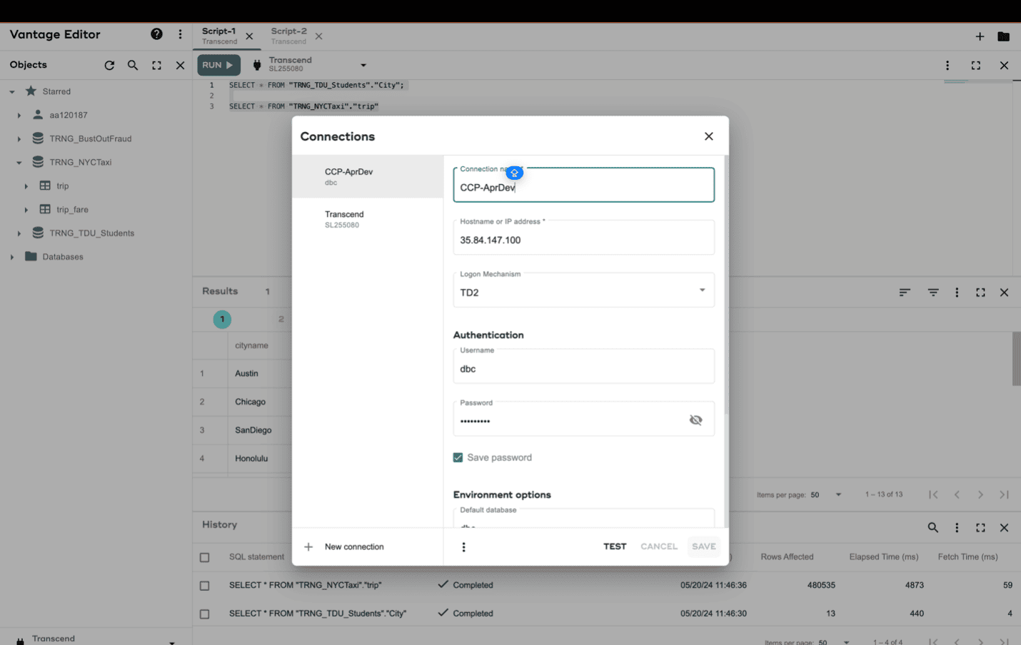 While doing data analysis, we often need to maintain multiple connections simultaneously, such as on-prem and cloud and dev, UAT, and prod environments.Using Vantage Editor Desktop, you can create or edit connections to multiple Teradata databases as needed. To create or edit any connection, simply select Edit Connections, an option available in the bottom left or any open script tab. This will open a new dialog through which you can set all the connection parameters. There are two log-on mechanism options currently available: TD2 and LDAP.