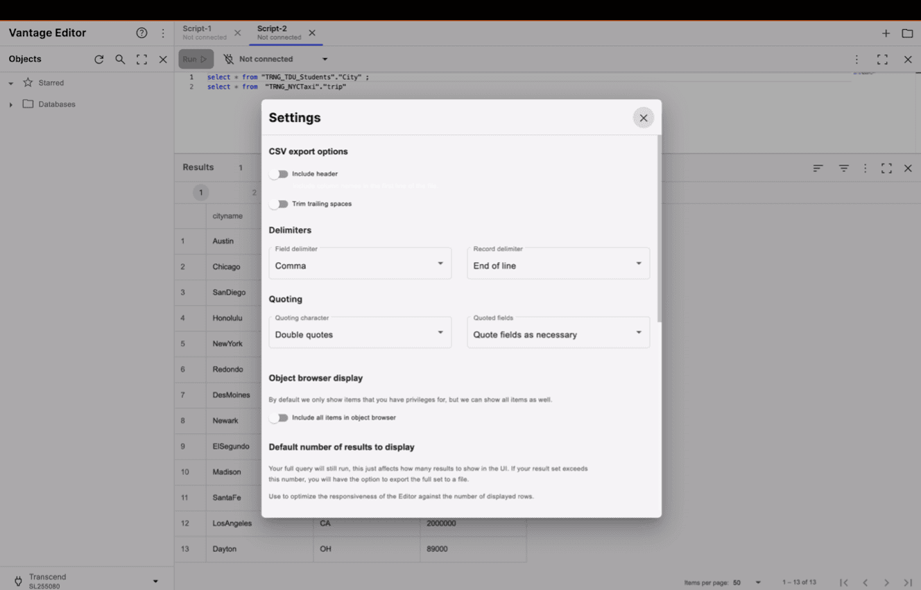 The Vantage Editor Desktop experience can be customized to your liking. Within the settings option, you can apply several different preferences, including:- Apply multiple options while exporting the result set to CSV. For example, you can trim trailing space and put different delimiters of your choice for fields and records.