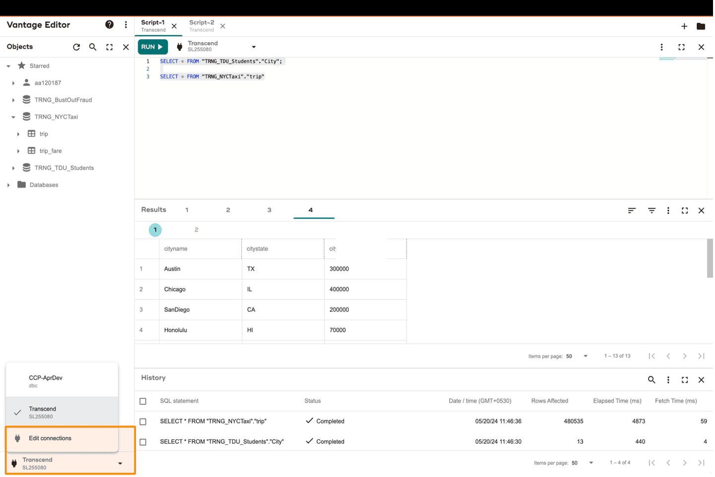 With an ever-increasing amount of data to navigate and manage, often from multiple databases, the ability to explore databases, tables, and views becomes imperative in understanding, shortlisting, and then leveraging the necessary data.Using this editor, you can load all database objects related to the connection selected, such as databases and tables, in the bottom left of Vantage Editor Desktop. You can search by database object name, mark them as favorites so that you can easily navigate even when the list has millions of database objects, and easily access them later. You have an insights option to see the details of the table, such as the SQL query used to create it, different column types, and the number of rows present in the table. Also, if you want to upload data into any table, you can select that table and upload data through a CSV file.