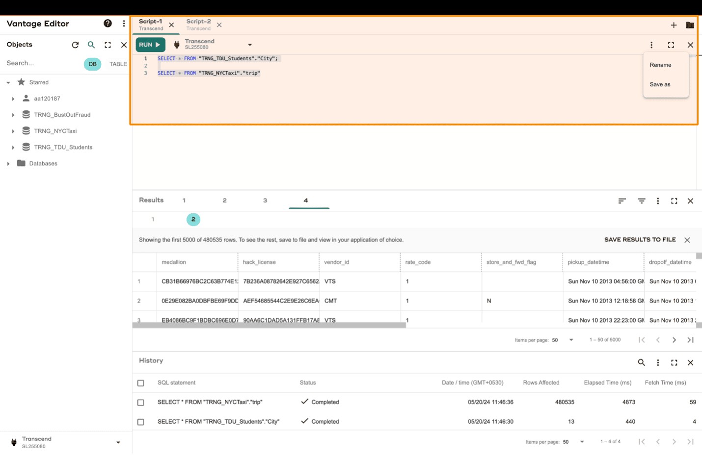 Many of us work on multiple data problems in parallel and prefer to organize and categorize queries logically. Vantage Editor Desktop provides script tab options that enable you to:- Create, edit, and execute queries in script tabs