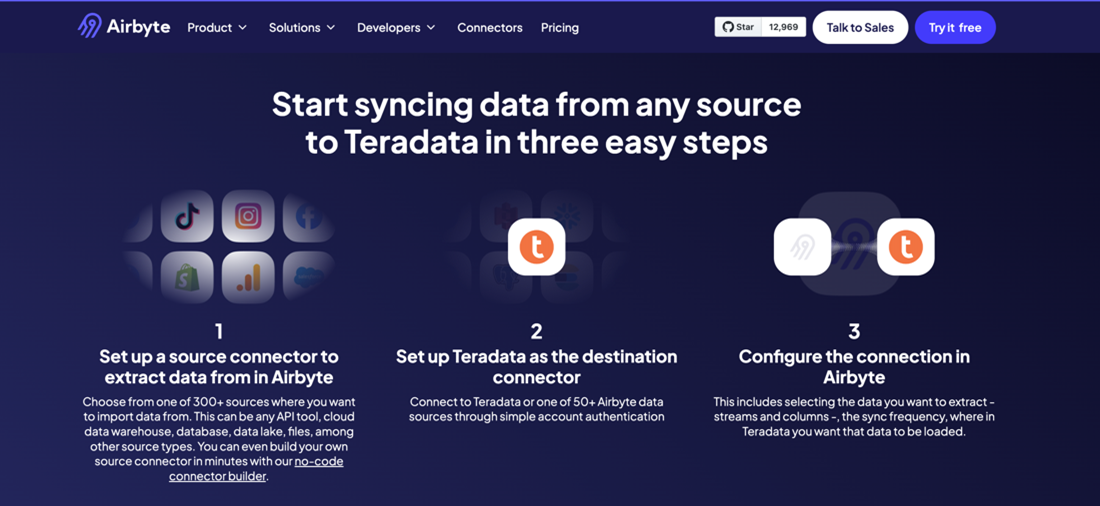 Airbyte Cloud offers a 14-day free trial that begins after your first successful sync. Plus, Teradata offers access to a free environment on the ClearScape Analytics Experience, the perfect sandbox to explore over 80+ real-world use cases across multiple industries and analytic functions.