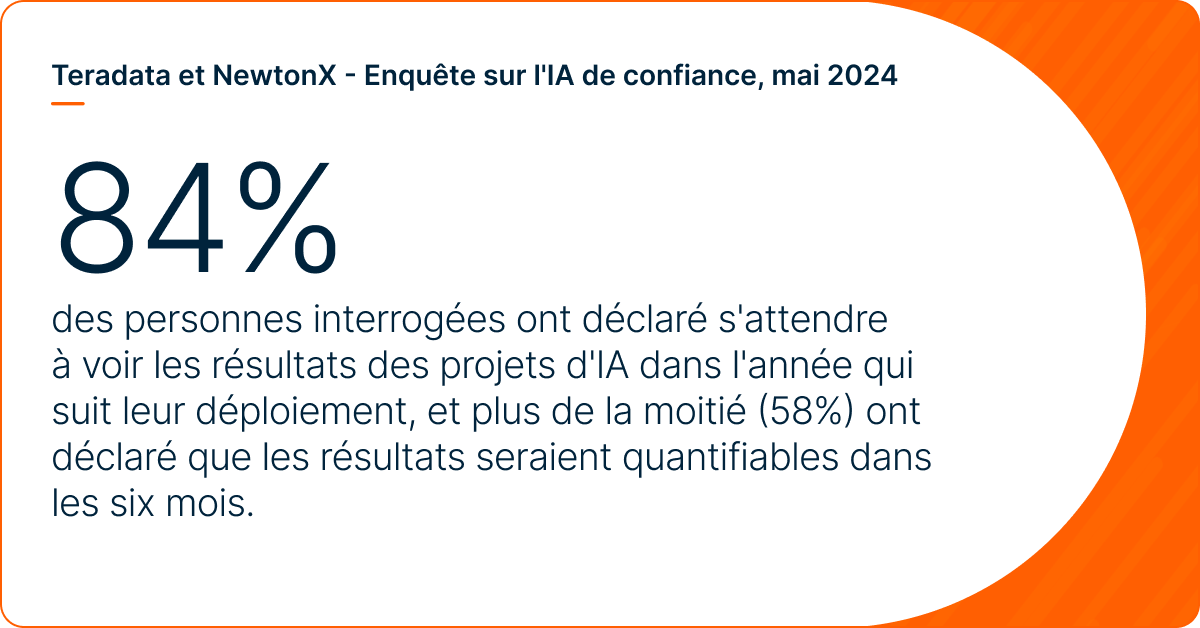 La plupart des personnes interrogées (84 %) affirment qu’elles s’attendent à constater les résultats des projets d’IA moins d’un an après le déploiement de la technologie. Plus de la moitié d’entre elles (58 %) déclarent que ces résultats devraient être quantifiables dans les six mois. Enfin, 60 % des sondés déclarent avoir déjà constaté un retour sur investissement (ROI) « démontrable » concernant leurs solutions d’IA existantes.